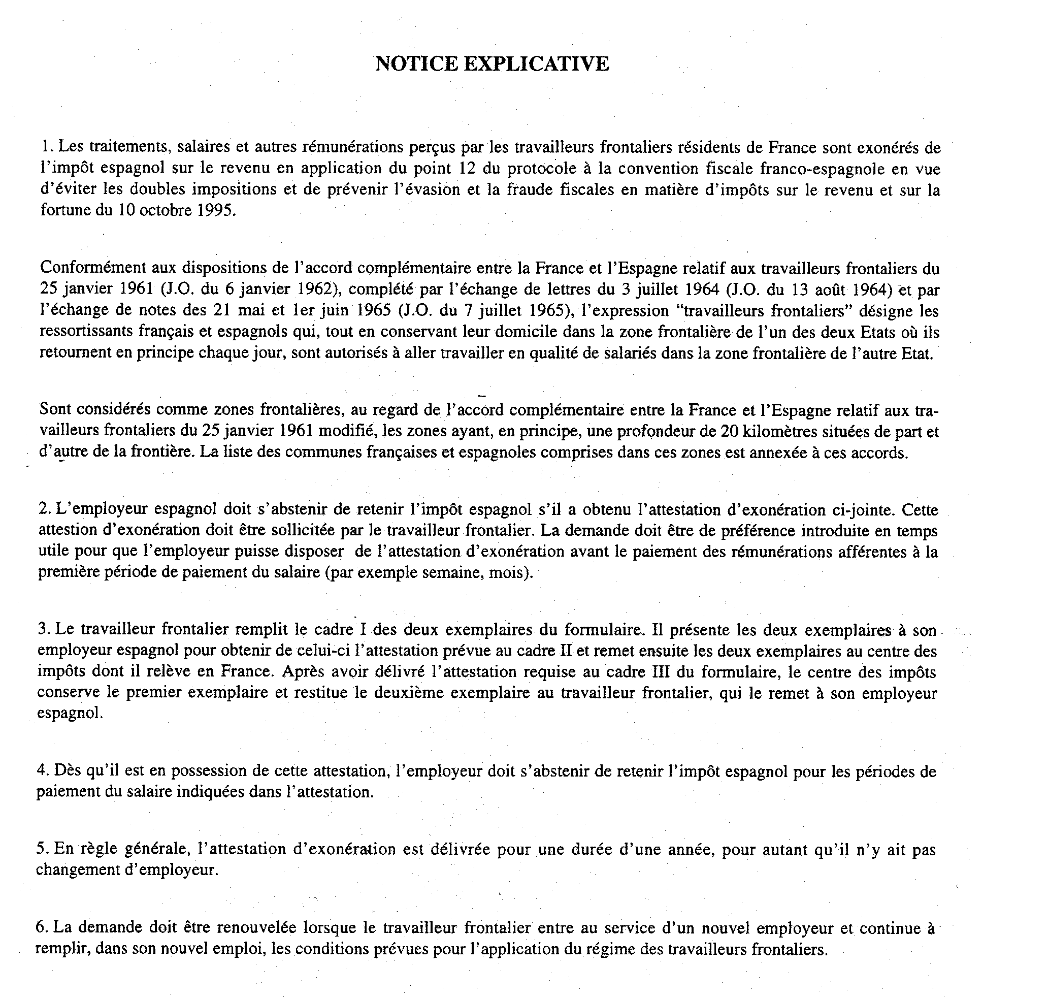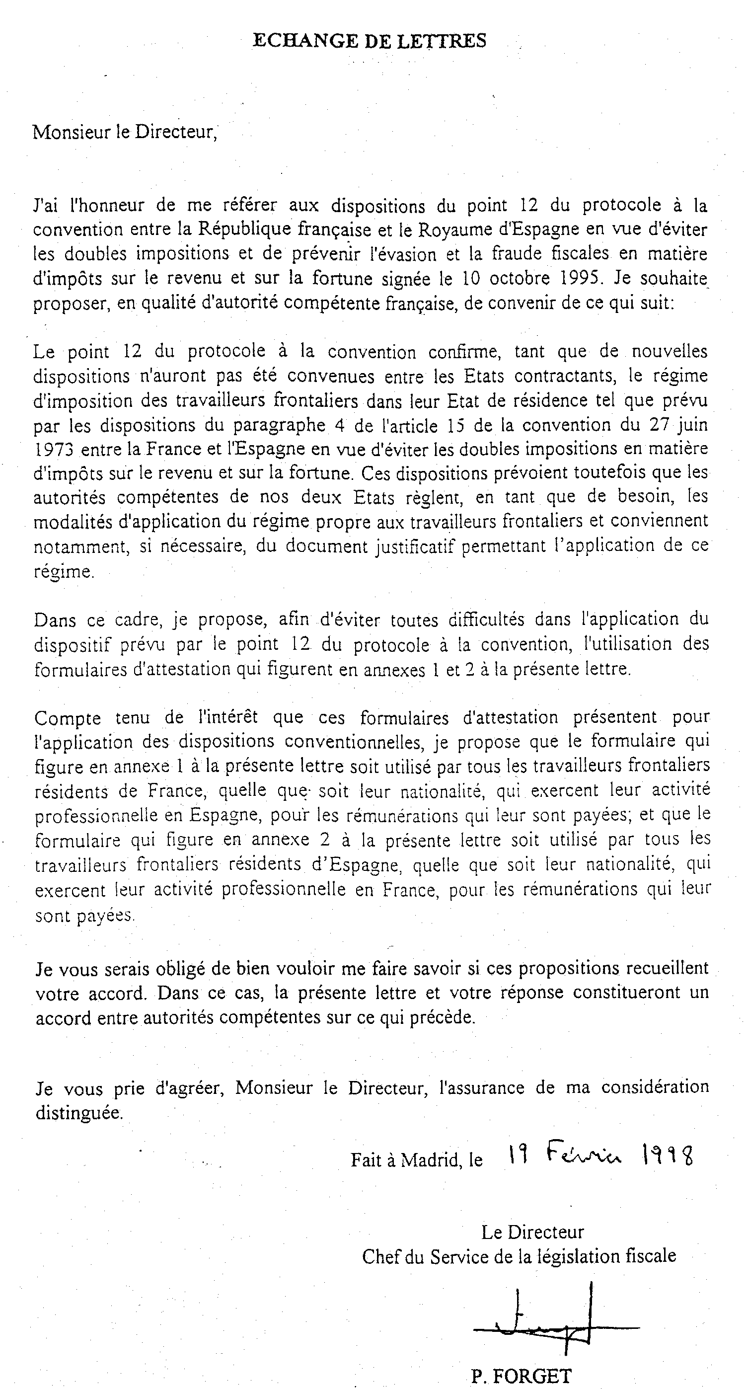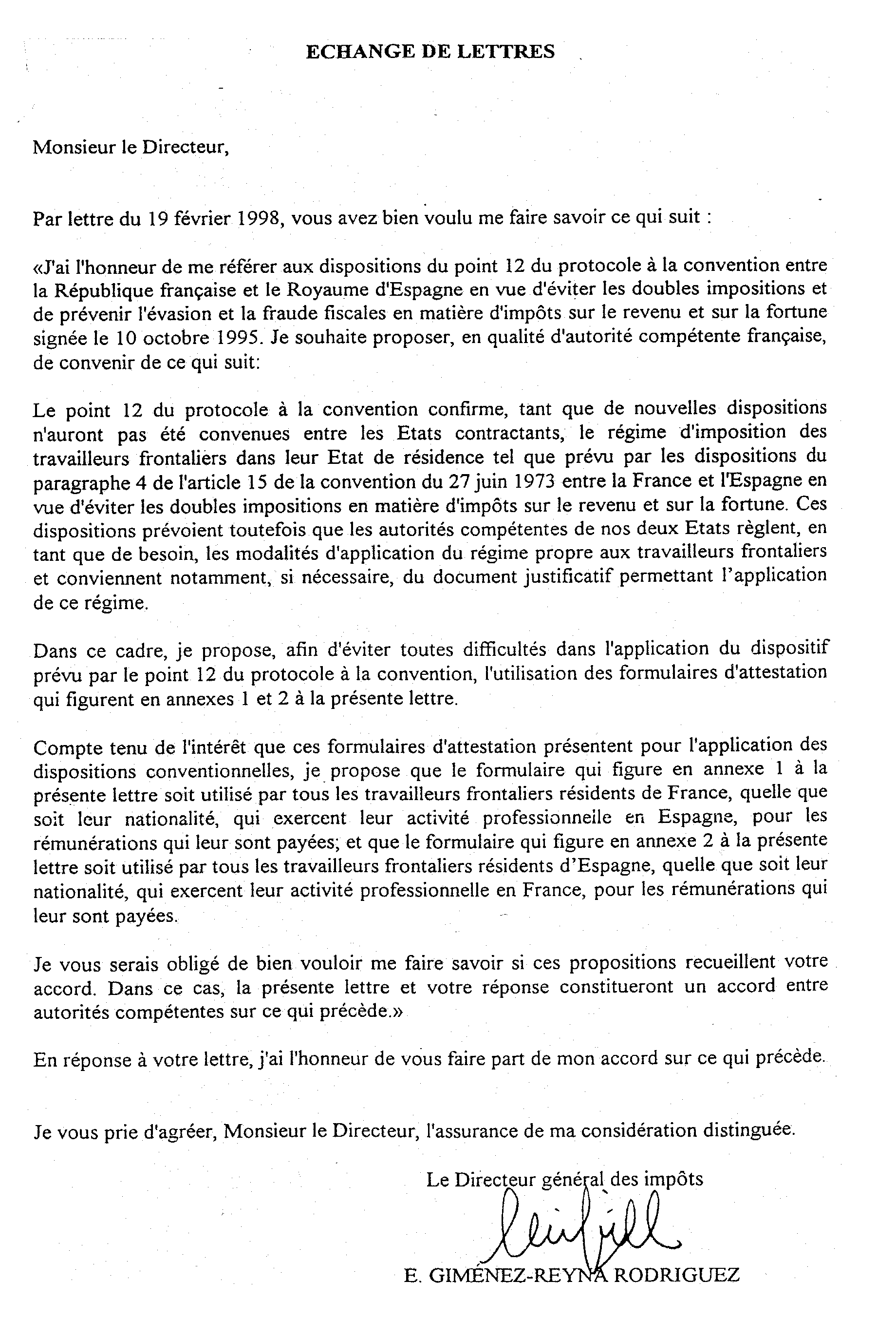 Le B.O.I. publié sous la référence 14 A-1-03 N° 23 du 5 FEVRIER 2003 concernant la publication de l'échange de lettres entre la République française et le Royaume d'Espagne du 10 octobre 1995.
