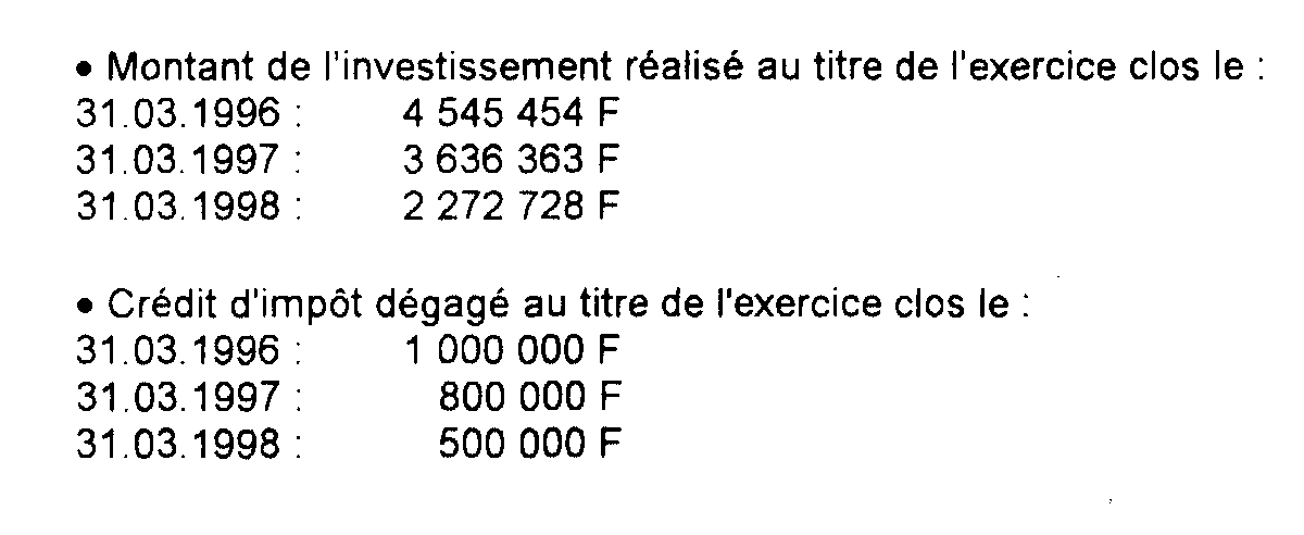 - au cours de l'exercice clos le 31.03.2000 : un bien acquis au cours de l'exercice clos le 31.03.1996 auquel correspond une quote-part de crédit d'impôt de 100 000 F ;