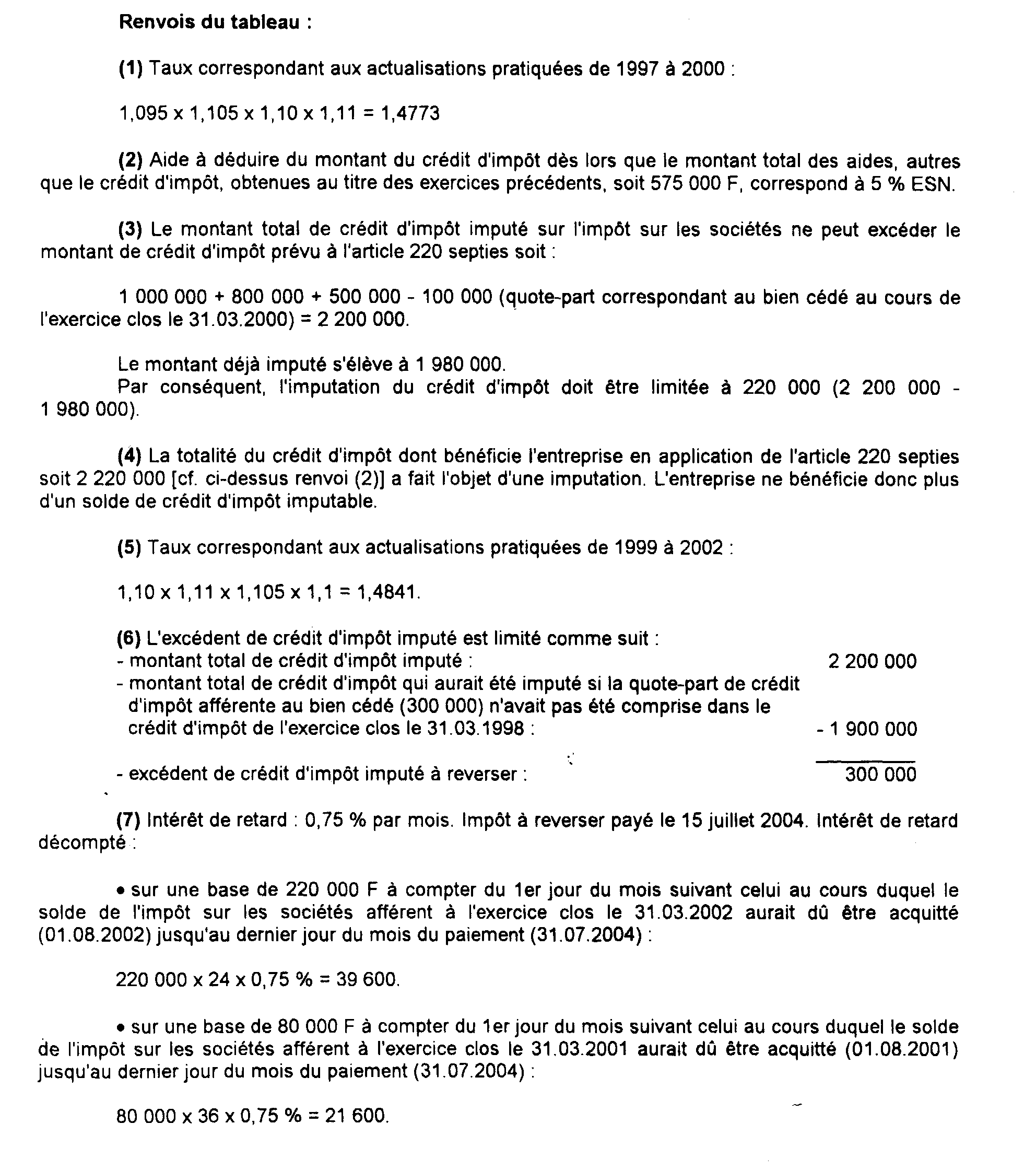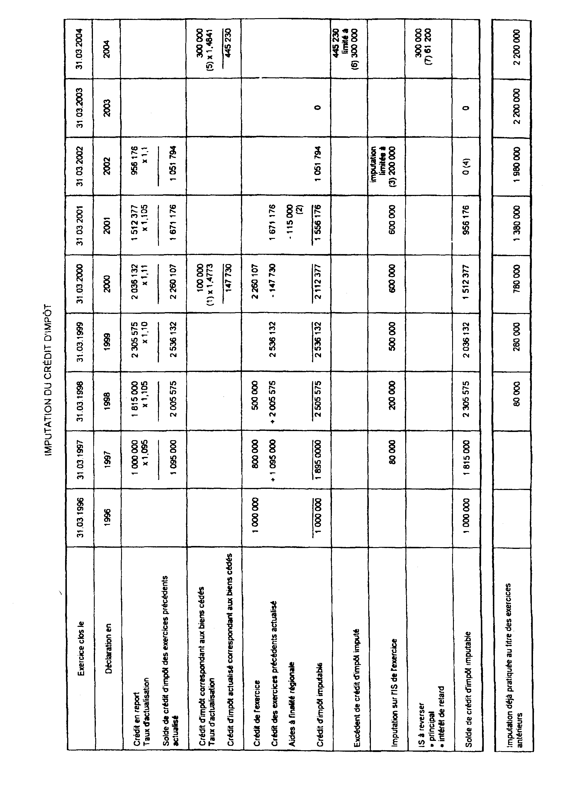 - au cours de l'exercice clos le 31.03.2004 : un bien acquis au cours de l'exercice clos le 31.03.1998 auquel correspond une quote-part de crédit d'impôt de 300 000 F.